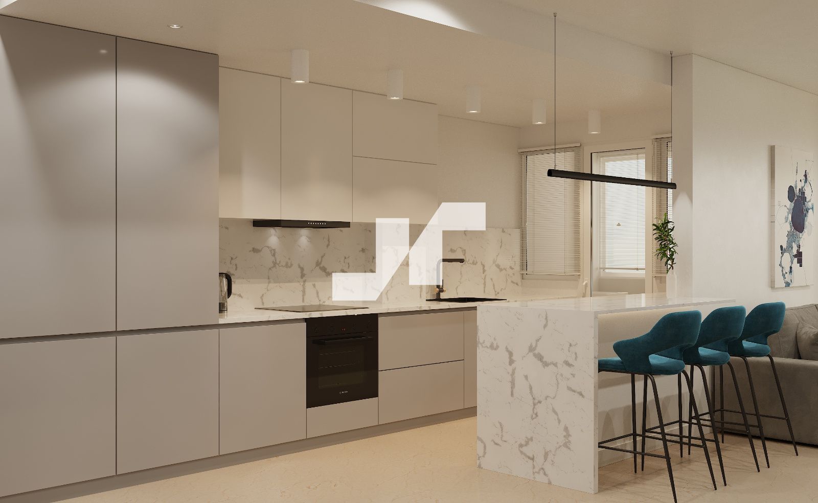 La cocina se entrega totalmente amueblada, con mobiliario de diseño moderno, encimera de cuarzo compacto y electrodomésticos de alta eficiencia energética, incluyendo placa de inducción con extracción integrada o campana según tipología.